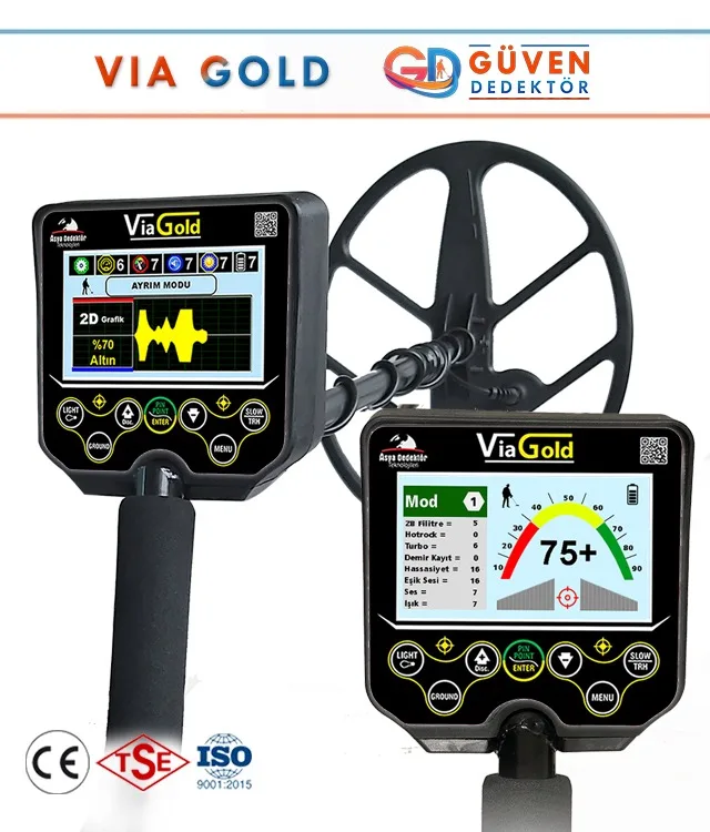 VIA GOLD define altın dedektörü, Türkiye’de üretilen ve 2023 yılında piyasaya sürülen bir metal dedektörüdür. VLF (Very Low Frequency) teknolojisine sahip olan dedektör, altın, gümüş, bronz, bakır gibi değerli metallerin yanı sıra demir ve alüminyum gibi metalleri de algılayabilmektedir. Dedektör, 28 cm’lik DD başlığa sahiptir. Bu başlık, hem yüzeysel hem de derin aramalarda etkilidir. Dedektörün maksimum algılama derinliği 2 metredir.